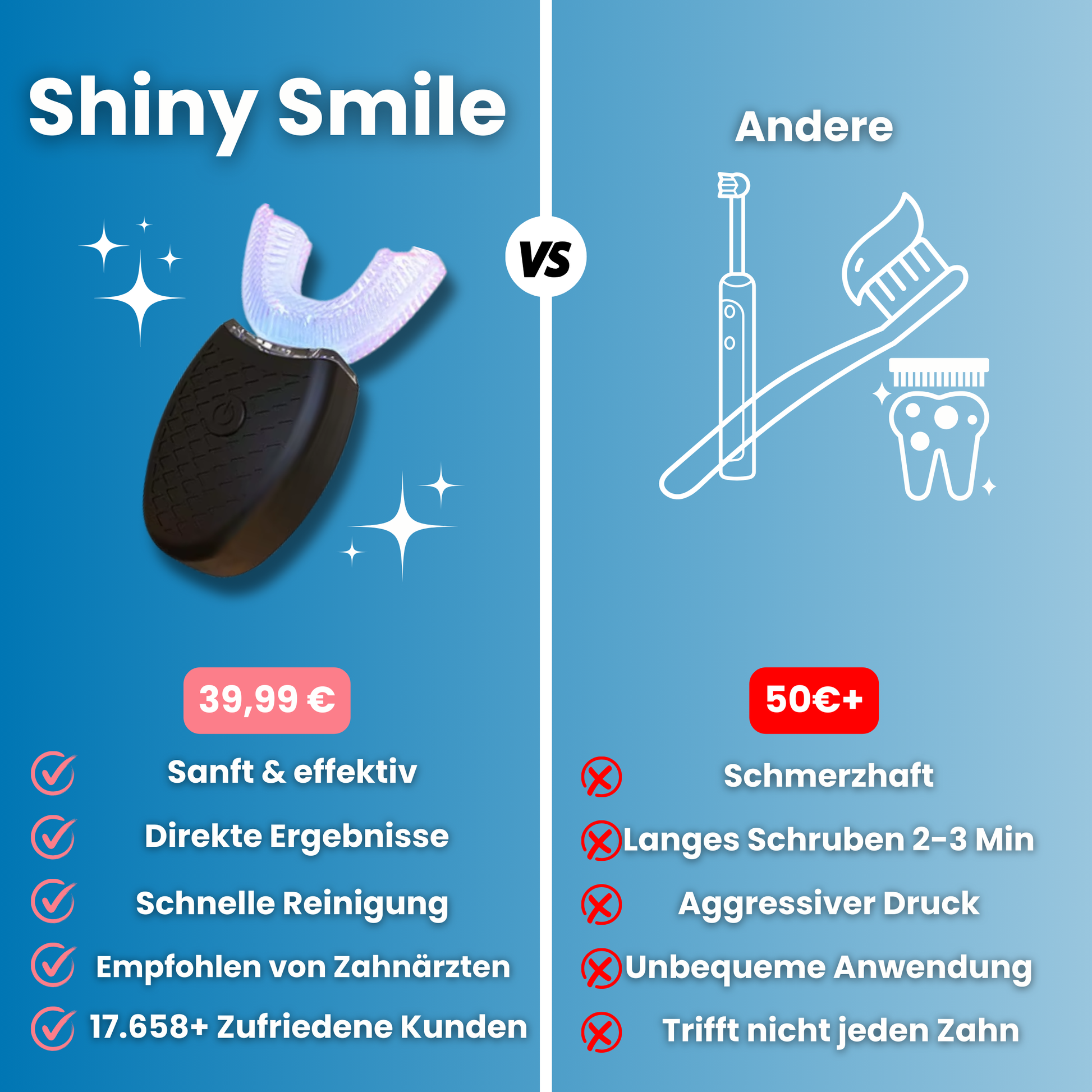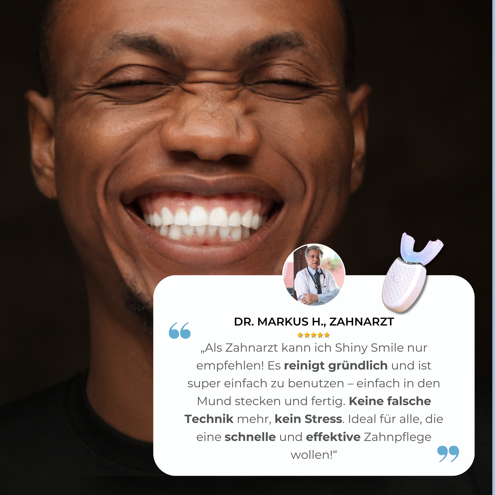 Hol dir jetzt dein Shiny Smile und erlebe Zahnpflege, die keine Zeit mehr kostet! Einfach reinstecken, entspannen und in Sekunden strahlend saubere Zähne haben. Worauf wartest du? Dein perfektes Lächeln ist nur einen Klick entfernt!